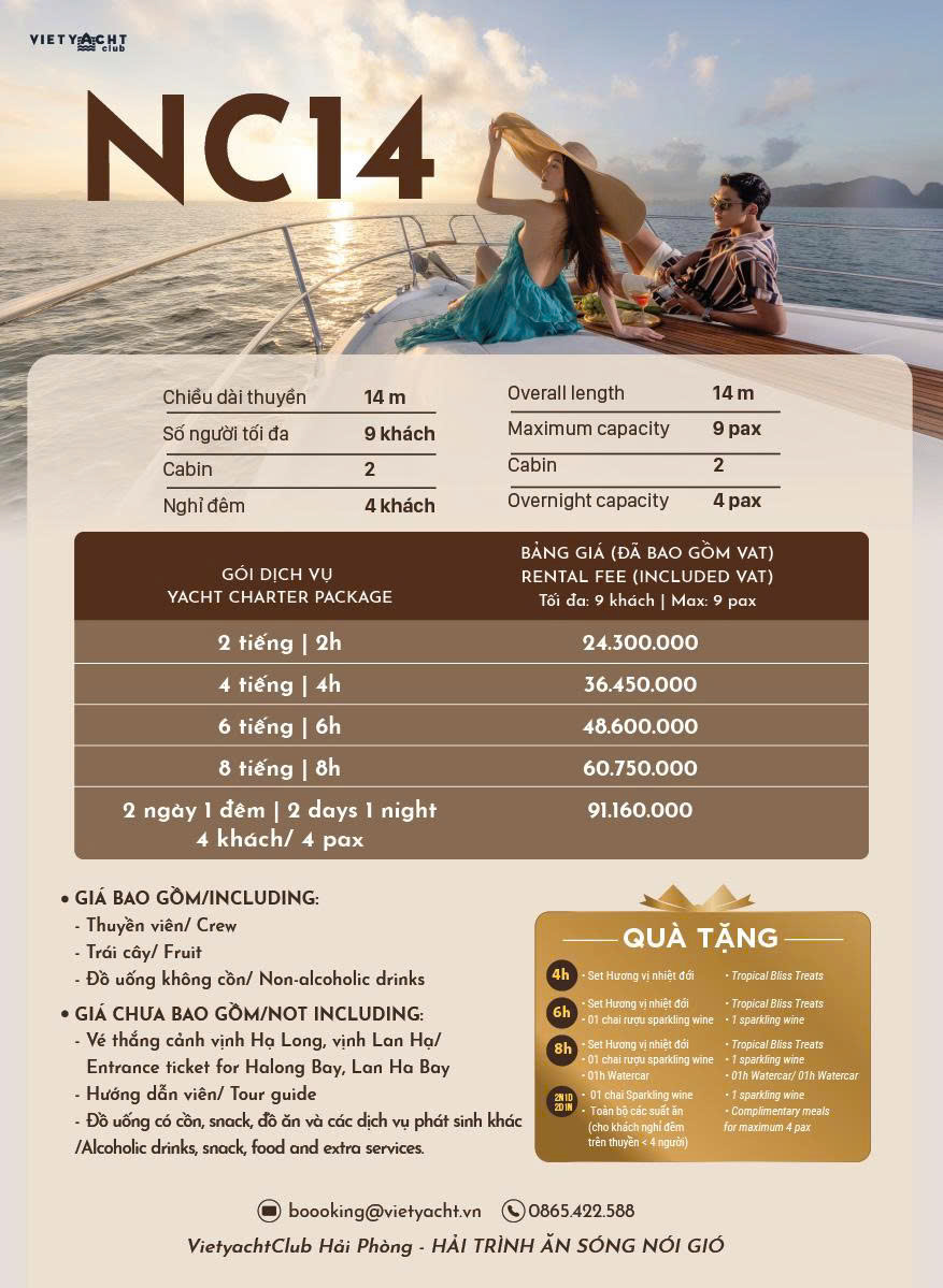 Đây là mẫu du thuyền tinh tế và thanh lịch. NC 14 được thiết kế và trang bị đầy đủ để đáp ứng toàn bộ nhu cầu trong những chuyến du ngoạn cùng gia đình và bạn bè.