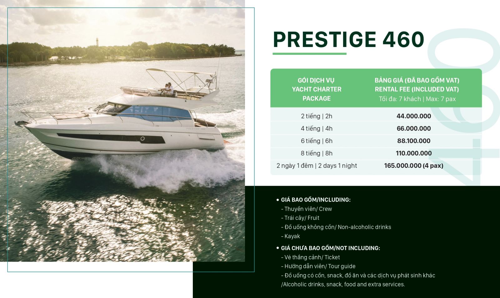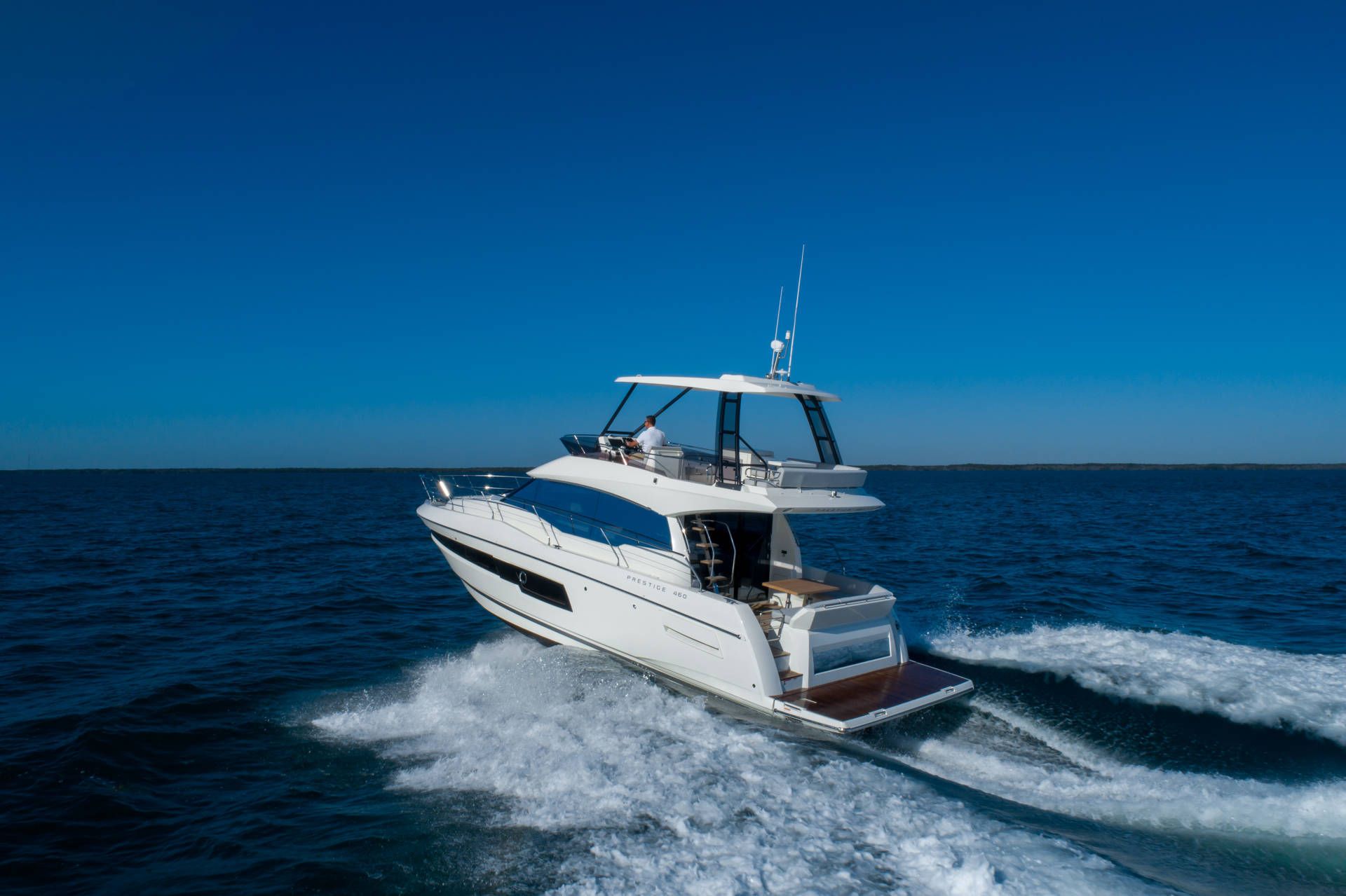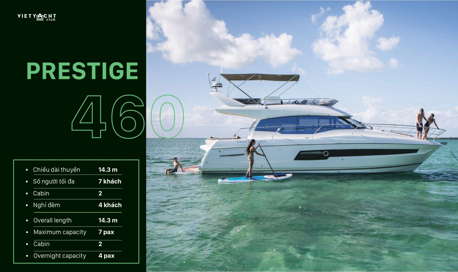 Prestige 460 là mẫu du thuyền flybridge lý tưởng dành cho những ai tìm kiếm sự cân bằng giữa hiệu suất vận hành, thiết kế tinh tế và trải nghiệm sống đẳng cấp trên biển. Với đường nét thanh lịch, không gian rộng rãi cùng khả năng tối ưu công năng thông minh, mẫu du thuyền này mang đến cảm giác thoải mái như đang tận hưởng một kỳ nghỉ sang trọng ngay trên mặt nước. Prestige 460 không chỉ phù hợp cho những chuyến đi thư giãn cuối tuần mà còn là lựa chọn hoàn hảo cho những hành trình dài ngày cùng gia đình và bạn bè.