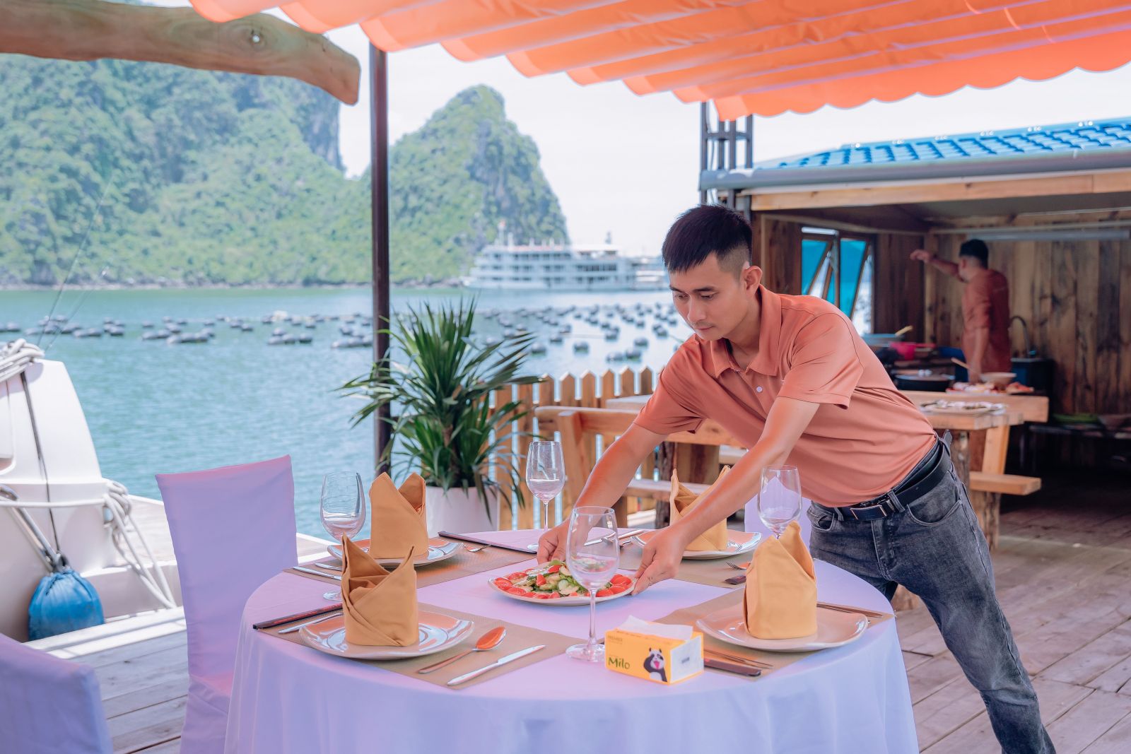 Một điểm cộng lớn của bè nhà hàng mà Vietyacht Club hợp tác chính là đội ngũ nhân viên thân thiện và tận tâm. Phong cách phục vụ không cầu kỳ nhưng chu đáo, từ cách giới thiệu món ăn, hỗ trợ khách quốc tế đến sự quan tâm trong từng chi tiết nhỏ.