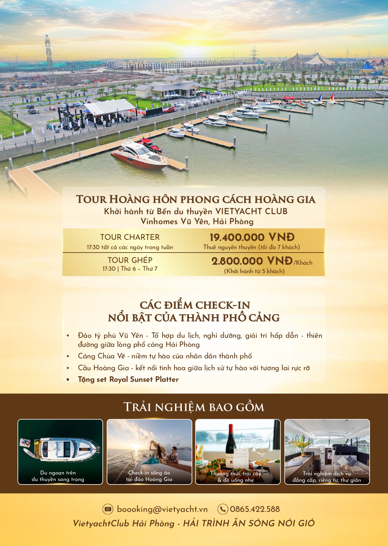 Một chuyến đi đặc biệt dành cho những tâm hồn yêu vẻ đẹp lãng mạn và tinh tế. Bắt đầu từ bến du thuyền Vũ Yên sang trọng, hành trình đưa du khách dạo qua những cung đường biển tĩnh lặng trước khi chạm đến đảo Tỷ Phú – nơi thiên nhiên và con người gặp gỡ trong một bản giao hưởng tuyệt mỹ. Khi ánh hoàng hôn buông xuống, cả không gian rực sáng bởi sắc cam, tím và vàng óng ả, tạo nên một bức tranh sống động ngay trước mắt. Khoảnh khắc ấy khi thiên nhiên và con người hòa cùng nhau chính là món quà mà đảo Tỷ Phú mang lại.