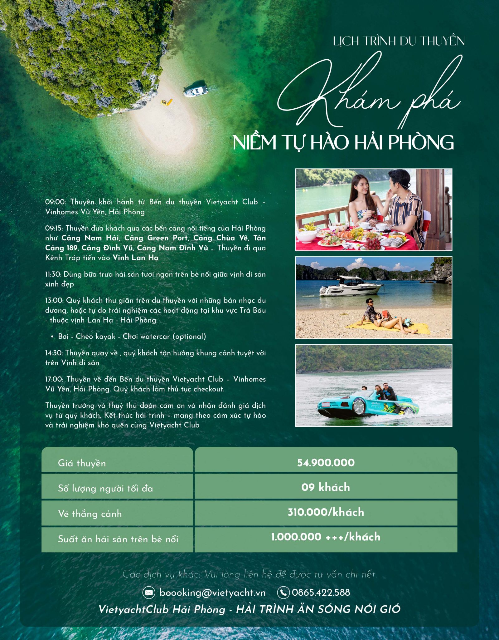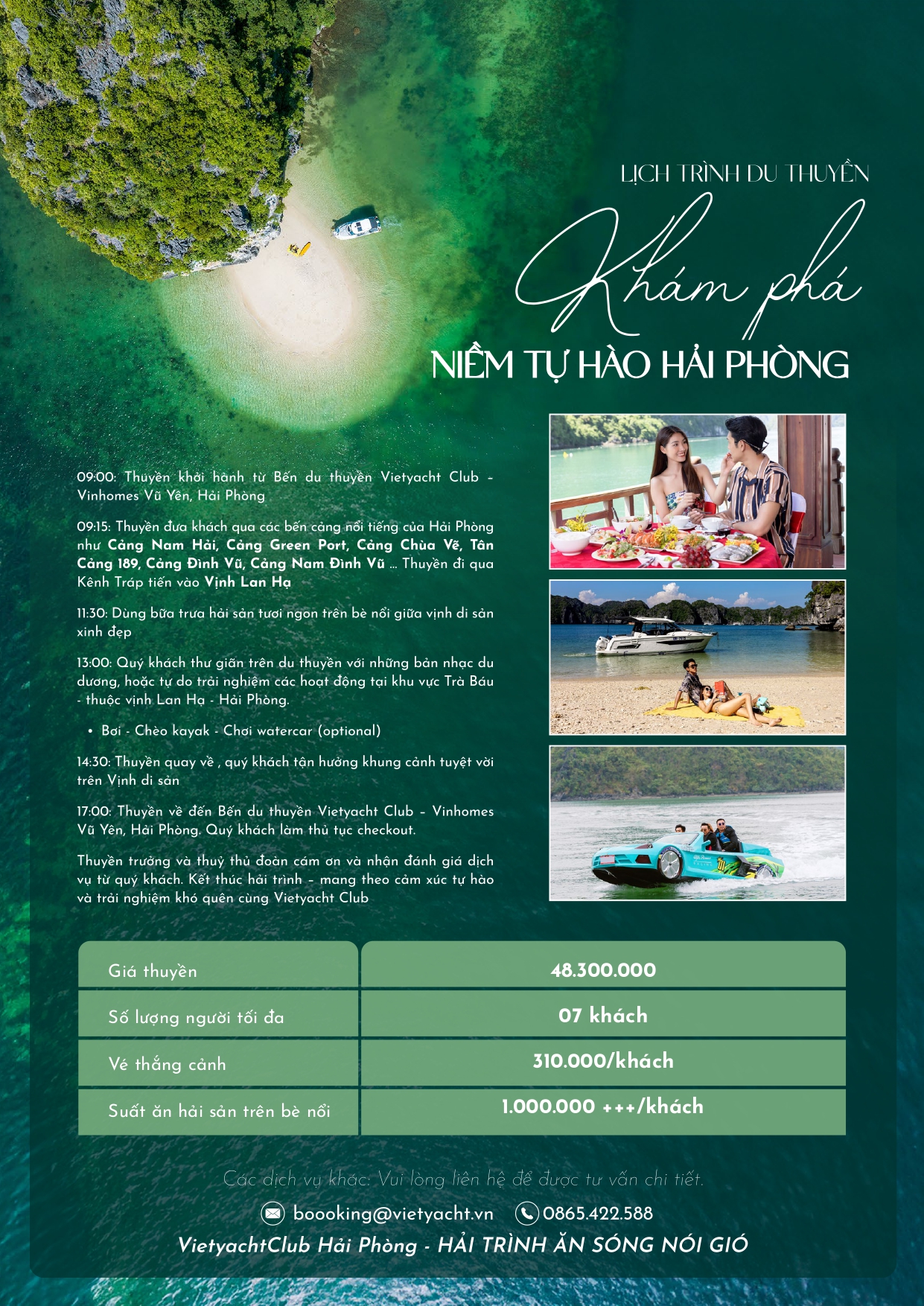 Khởi hành từ bến du thuyền sang trọng, chuyến đi mở ra cánh cửa đến vịnh Lan Hạ – viên ngọc xanh yên bình của Hải Phòng. Giữa hàng trăm hòn đảo đá vôi kỳ vĩ và làn nước trong xanh ngọc bích, du khách được tận hưởng hành trình riêng tư trên du thuyền cá nhân, nơi từng khoảnh khắc đều trở thành trải nghiệm đáng nhớ. Đây không chỉ là chuyến tham quan, mà còn là hành trình sống chậm, thưởng ngoạn và lưu giữ những khoảnh khắc thanh bình giữa di sản thiên nhiên Hải Phòng.