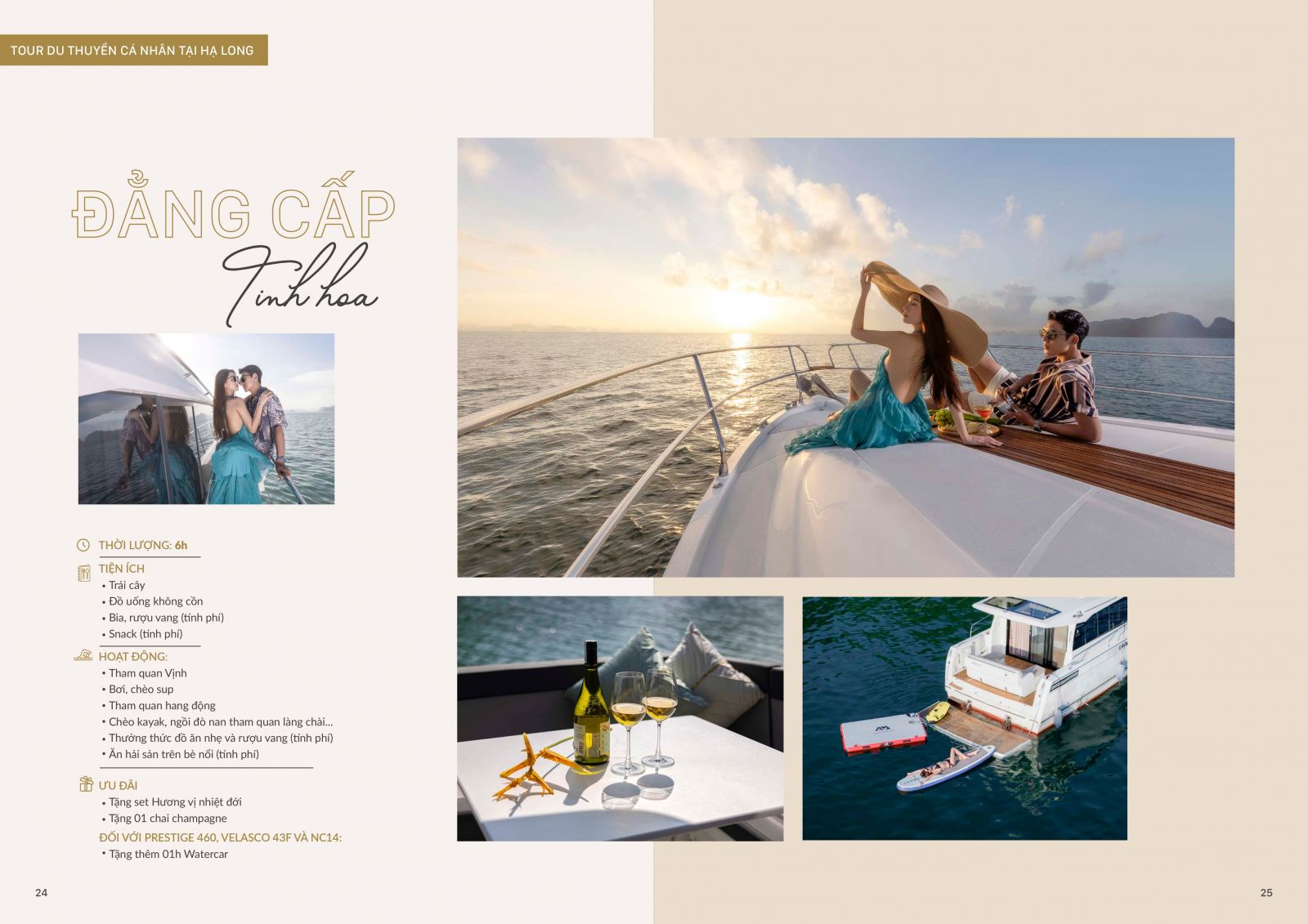 Nâng tầm hành trình khám phá vịnh Hạ Long và tận hưởng những khoảnh khắc riêng tư, thoải mái trên những chiếc du thuyền đẳng cấp nhất. Chiêm ngưỡng khung cảnh thiên nhiên kỳ vĩ, xinh đẹp, thưởng thức champagne cùng bạn bè, cảm nhận hơi thở của sự xa xỉ giản đơn giữa thiên nhiên. Một bữa tiệc hải sản tươi ngon trên bè nổi giữa vùng biển lấp lánh sẽ một dấu ấn hoàn hảo để khép lại hải trình sang trọng và đẳng cấp này.