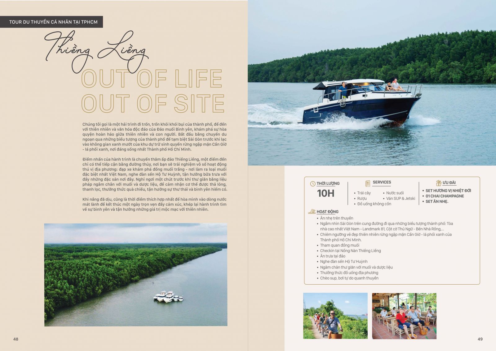 Điểm nhấn của hành trình là chuyến thăm ấp đảo Thiềng Liềng, một điểm đến chỉ có thể tiếp cận bằng đường thủy, nơi bạn sẽ trải nghiệm vô số hoạt động thú vị địa phương: đạp xe khám phá đồng muối trắng - nơi làm ra loại muối đặc biệt nhất Việt Nam, nghe đàn sến Hộ Tư Huỳnh, tận hưởng bữa trưa với đầy những đặc sản nơi đây. Nghỉ ngơi một chút trước khi thư giãn bằng liệu pháp ngâm chân với muối và dược liệu, để cảm nhận cơ thể được thả lỏng, thanh lọc, thưởng thức quà chiều, tận hưởng sự thư thái và bình yên hiếm có.